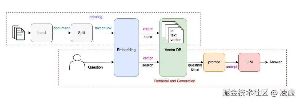 Indexing:构建知识库。Retrieval & Generation:从知识库中获取相关信息,然后生成结果。