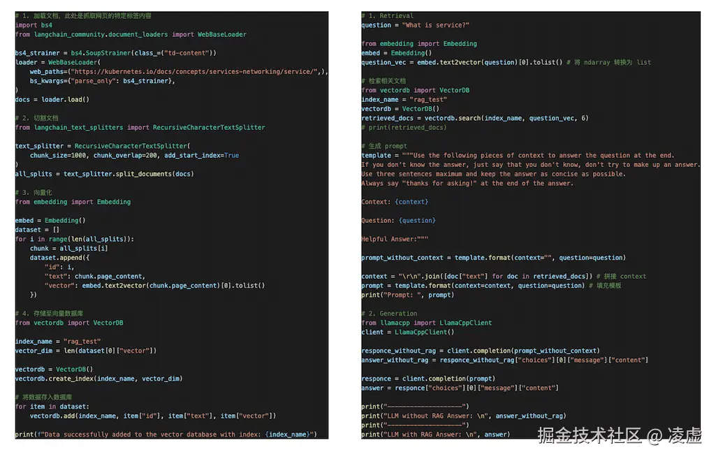 Embedding:将用户提出的问题转换为向量。search VectorDB:从知识库中查询与问题语义相近的文本段落。prompt:将检索出来的文本段落与用户问题合并,生成 prompt。LLM:将 prompt 提交给大语言模型,得到最终答案。