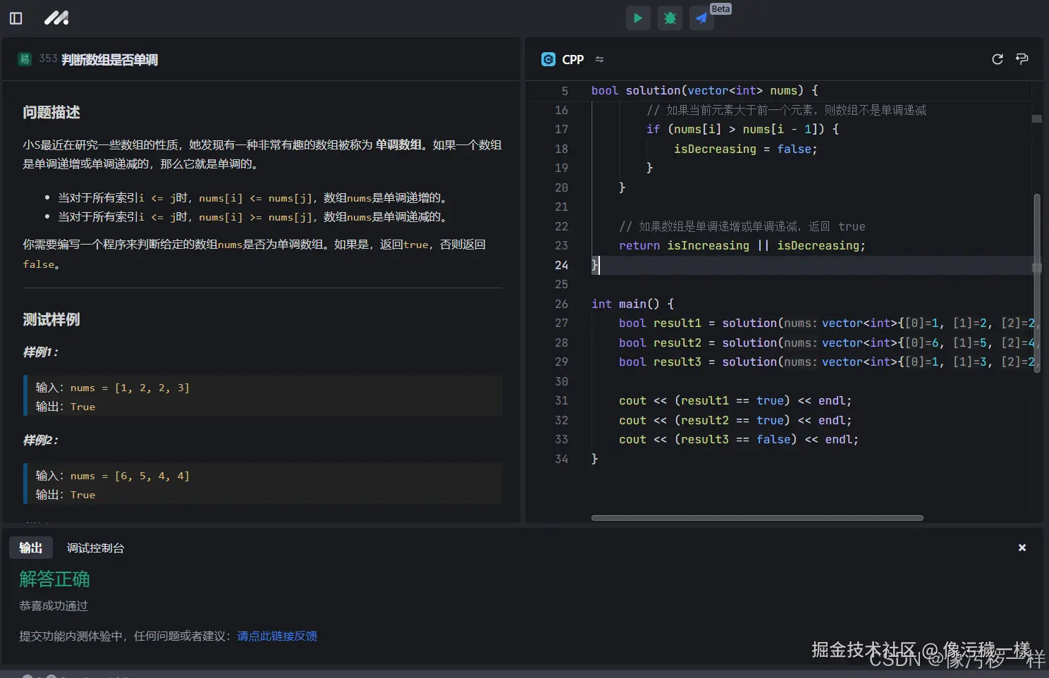 isIncreasing或isDecreasing中有一个为true,则说明数组是单调的,返回true。 - 否则,返回