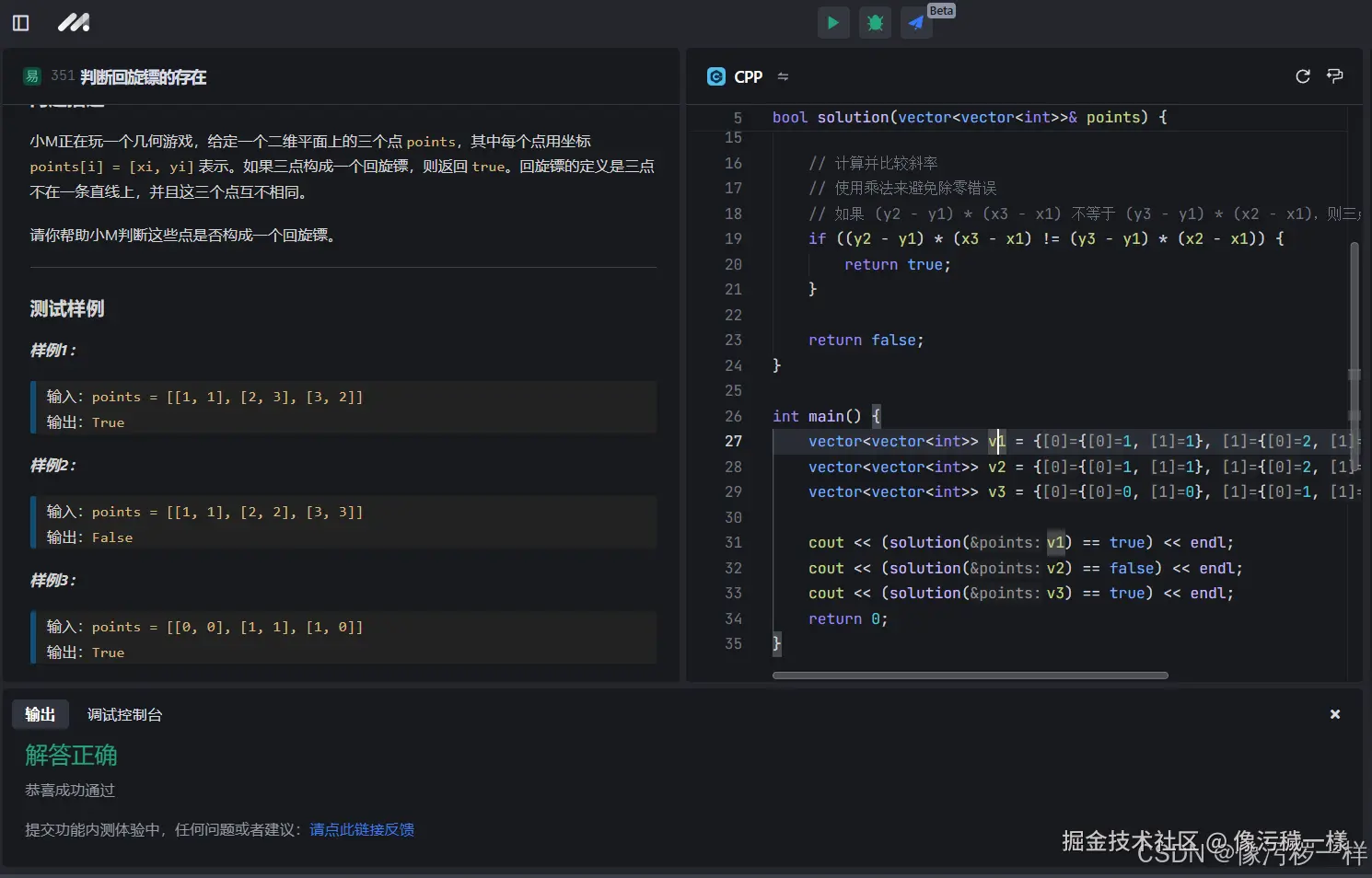 小M正在玩一个几何游戏,给定一个二维平面上的三个点 points,其中每个点用坐标 points[i] = [xi, yi] 表示。如果三点构成一个回旋镖,则返回 true。回旋镖的定义是三点不在一条直线上,并且这三个点互不相同。