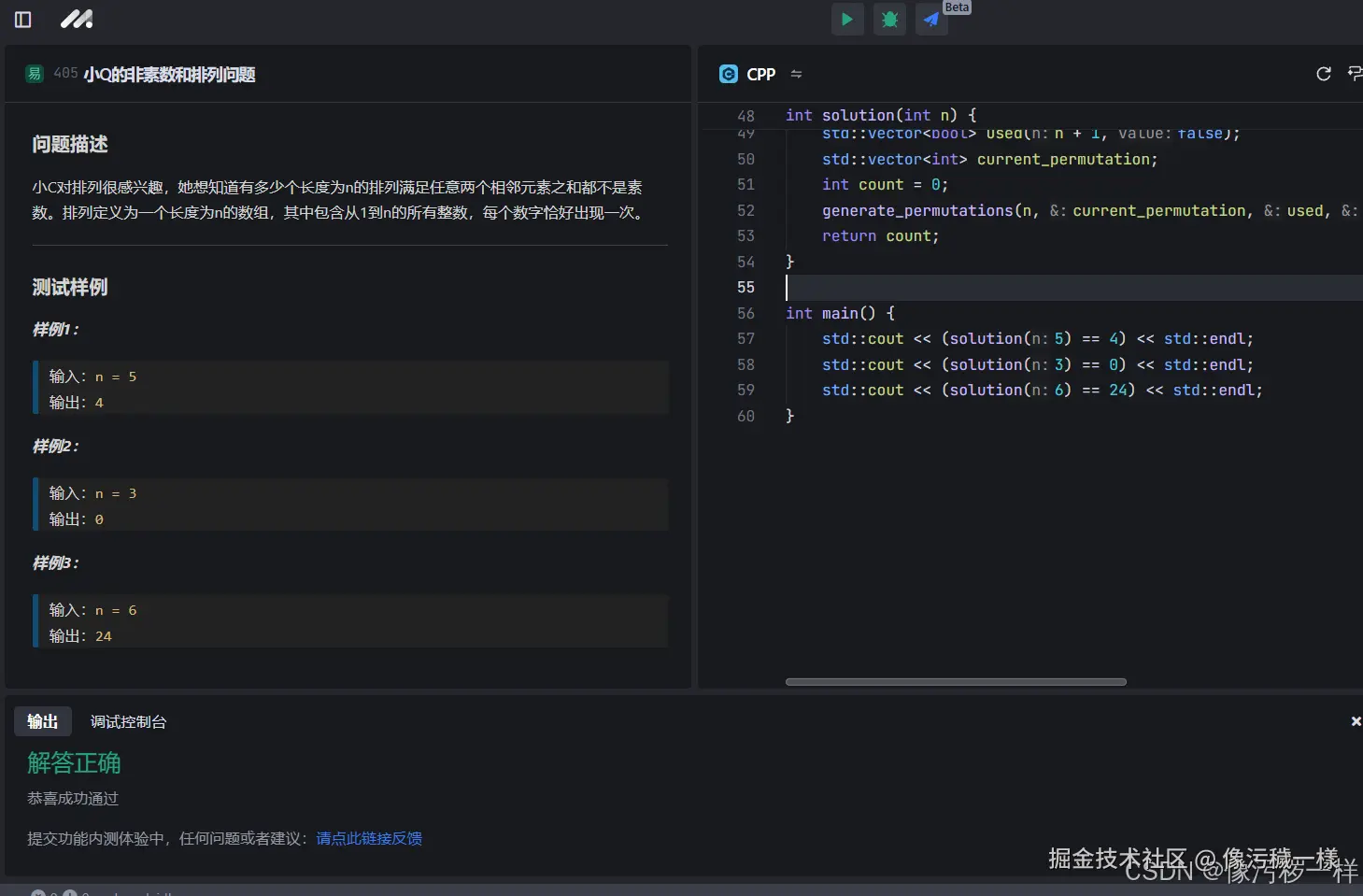 小C对排列很感兴趣,她想知道有多少个长度为n的排列满足任意两个相邻元素之和都不是素数。排列定义为一个长度为n的数组,其中包含从1到n的所有整数,每个数字恰好出现一次。