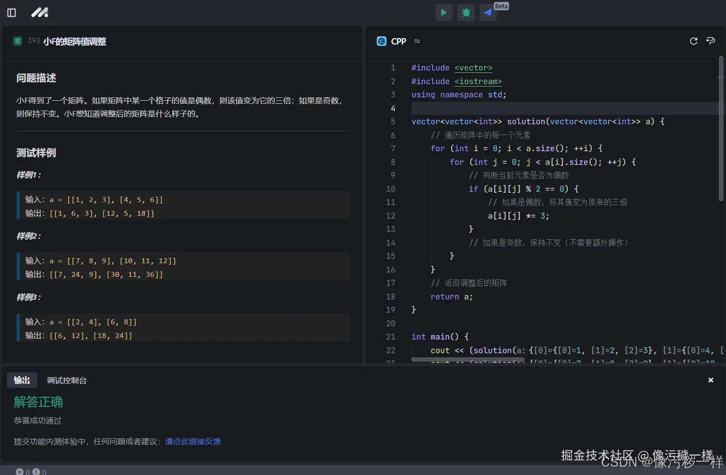 cout << (solution({{1, 2, 3}, {4, 5, 6}}) == vector<vector<int>>{{1, 6, 3}, {12, 5, 18}}) << endl;