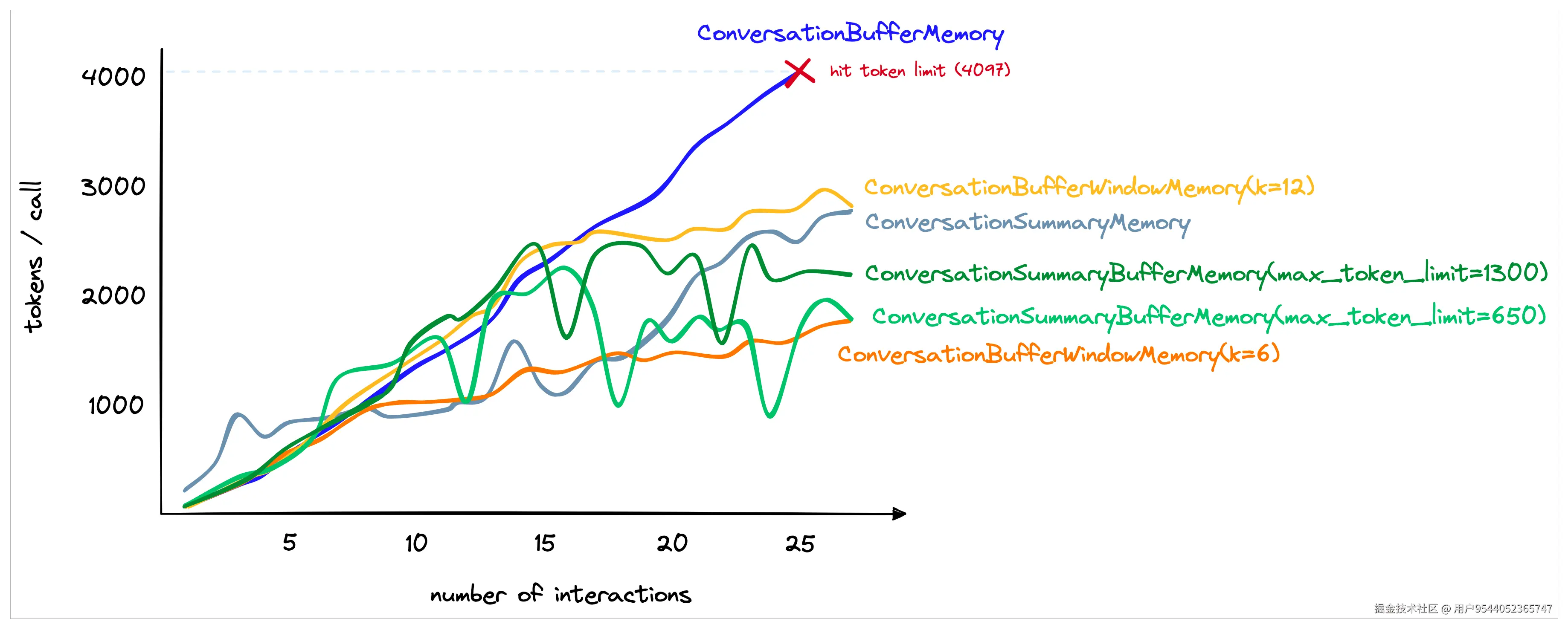 网上还有人总结了一个示意图,体现出了当对话轮次逐渐增加时,各种记忆机制对Token的消耗数量。意图向我们表达的是:有些记忆机制,比如说ConversationSummaryBufferMemory和ConversationSummaryMemory,在对话轮次较少的时候可能会浪费一些Token,但是多轮对话过后,Token的节省就逐渐体现出来了。