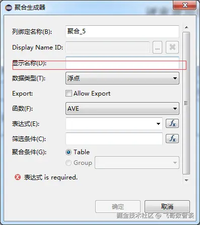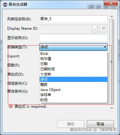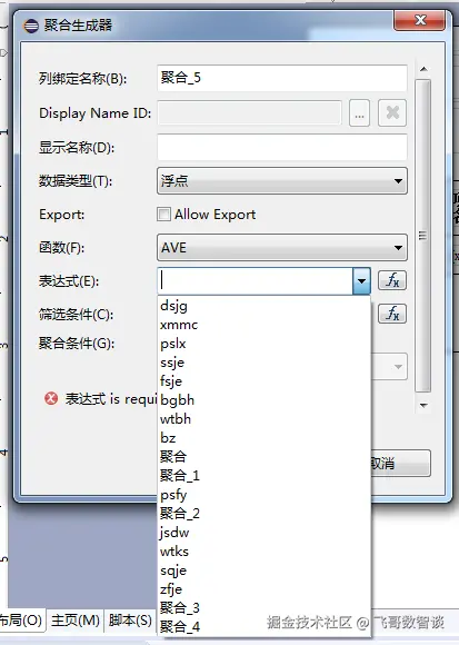 生成器:显示名称是用来显示在创作报表的页面,给制作人提供方便的;数据类型是选择返回的数据格式的,一般都是字符串格式(特别是聚合金额的时候使用字符串格式);函数是选择聚合方式,一般我们用到的是SUM(求和);