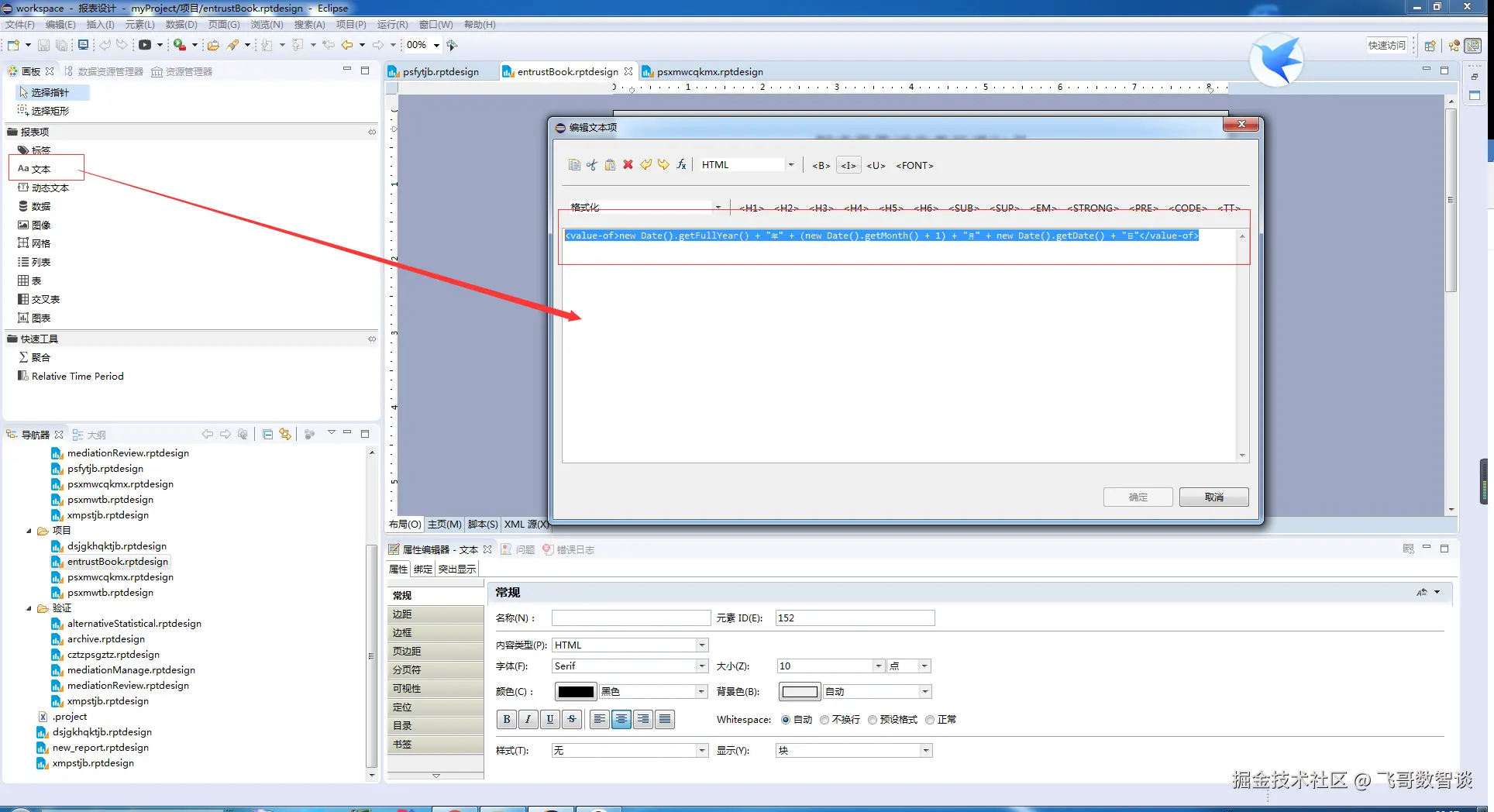 拖一个文本框,到显示时间位置松开,会弹出编辑文本项窗口,在窗口中输入'<value-of>new Date().getFullYear() + "年" + (new Date().getMonth() + 1) + "月" + new Date().getDate() + "日"</value-of>',点击确定。