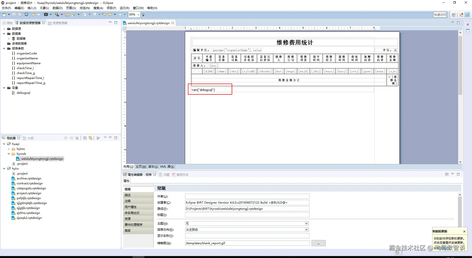 birt拼接SQL的地方使用JS语言,但是不能使用alert()及console.log()进行打印,如果想要调试SQL,可以采用以下方式输出。