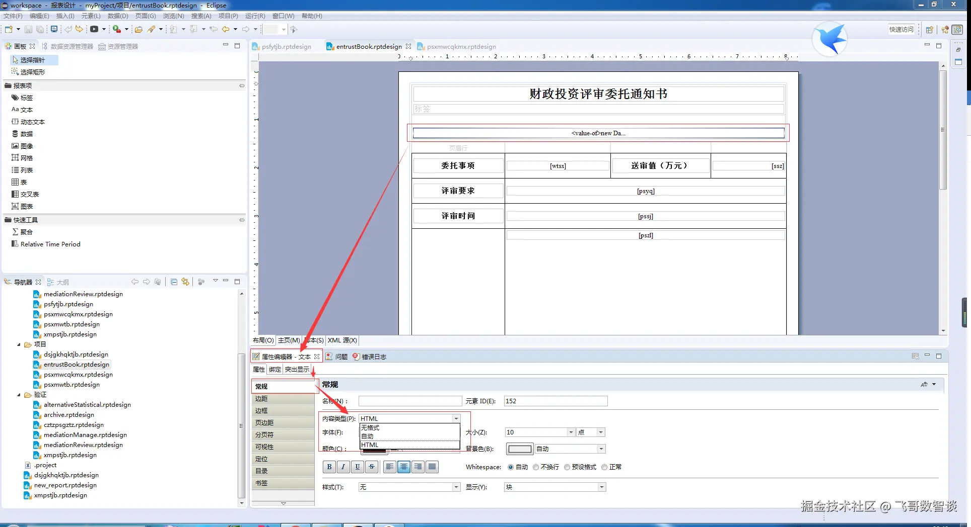 点击选中文本框,在下方属性编辑器点击常规,在右侧找到内容类型,下拉选择HTML即可。