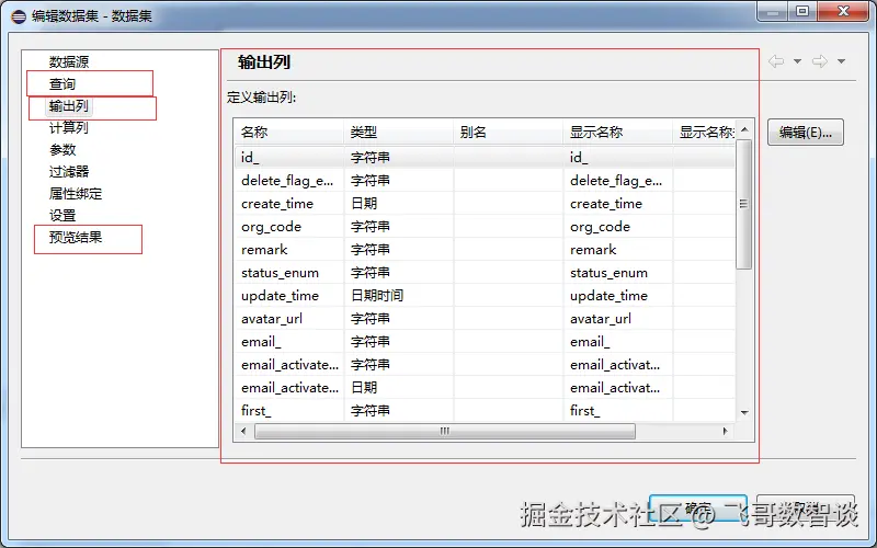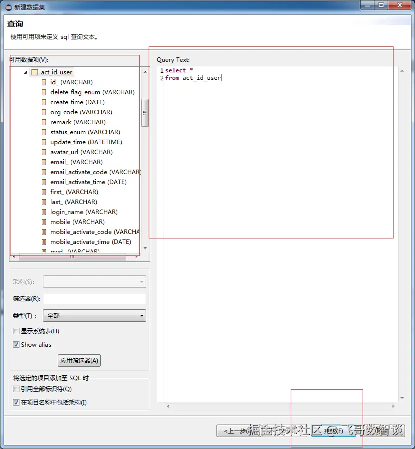 Query Text 这里面是写sql语句(例子:拿到act_id_user表中的所有数据)如果拿取的数据多表关联 用sql语句join拿取 可用数据项:这里面是查询出来的数据库中的表和字段,可以双击选择也可以拖拉到右侧进行使用 点击完成