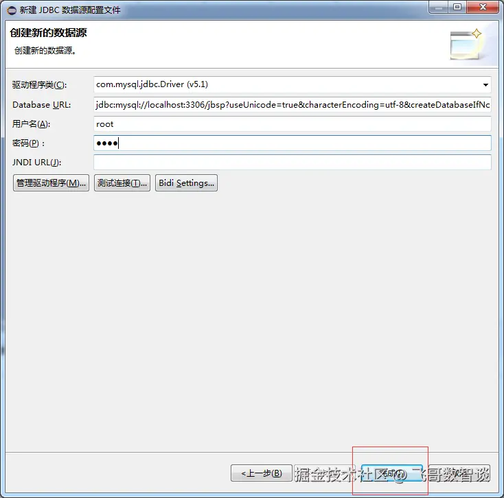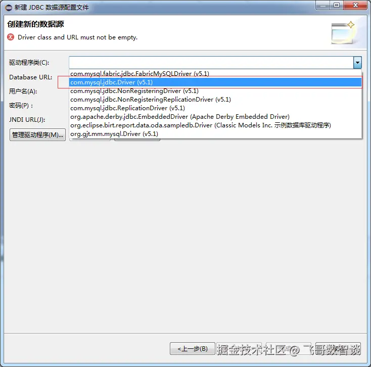 回到创建新的数据源窗口,在驱动程序类下拉中找到com.mysql.jdbc.Driver (v5.1)