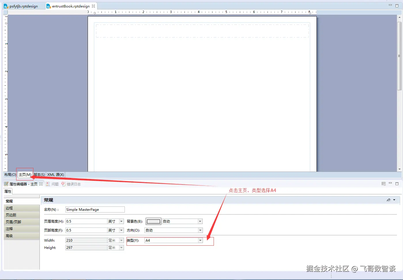 打开报表项目,点击分页栏中的主页,常规中选择类型为A4,即可设置。