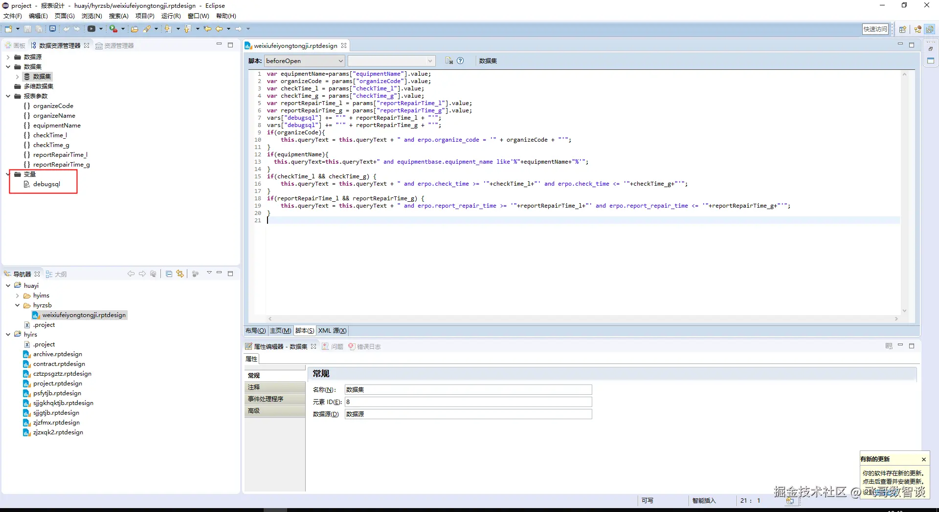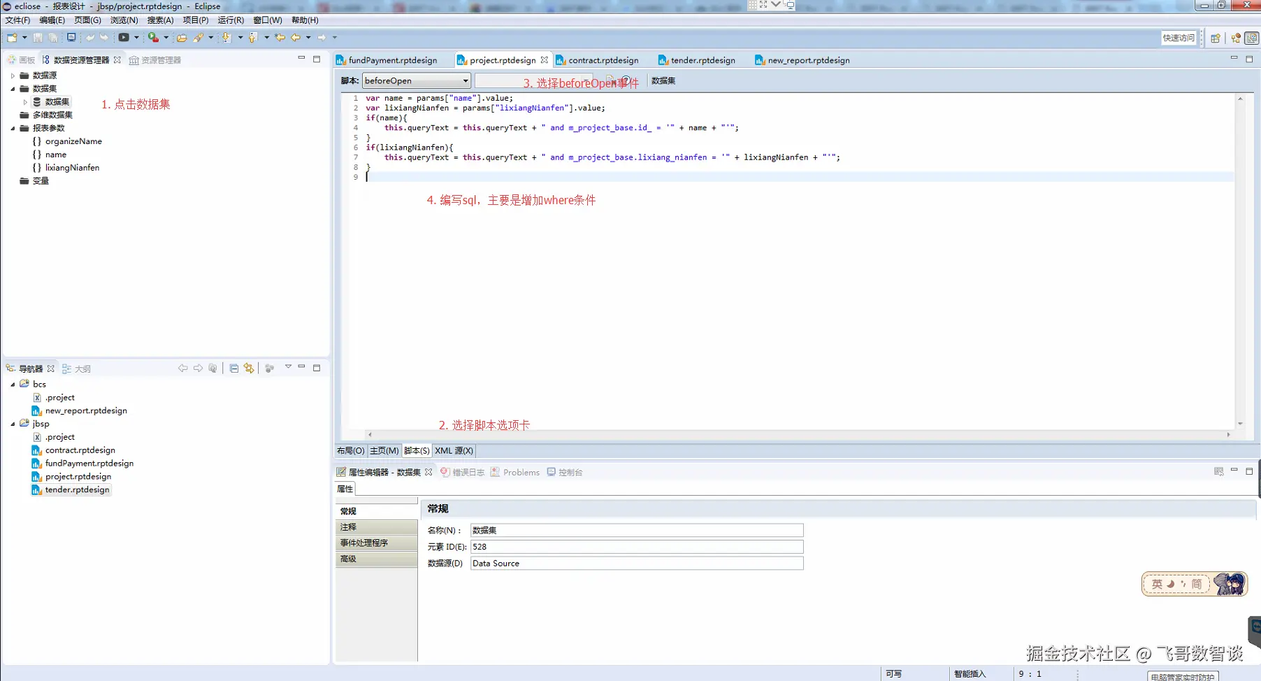 点击DataSet,然后选择beforeopen开始编写SQL拼接脚本。