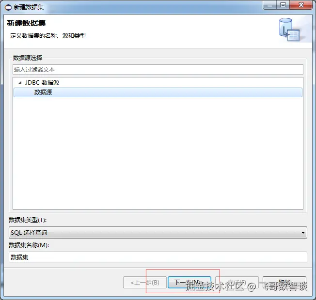 弹出新建数据集窗口,直接点击下一步,弹出查询窗口