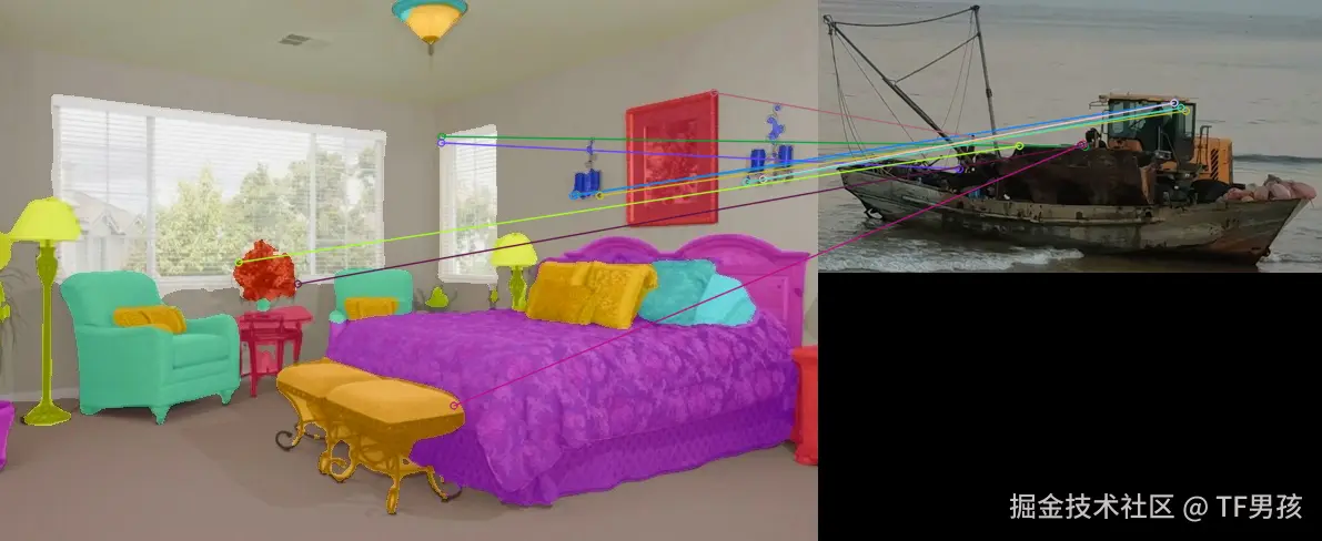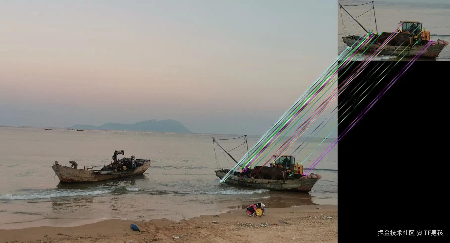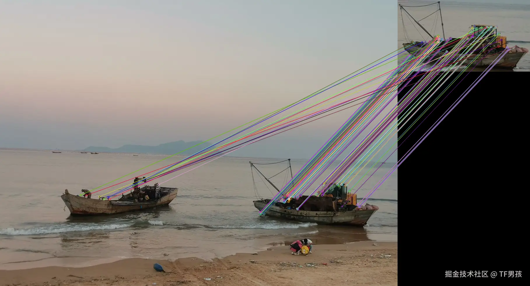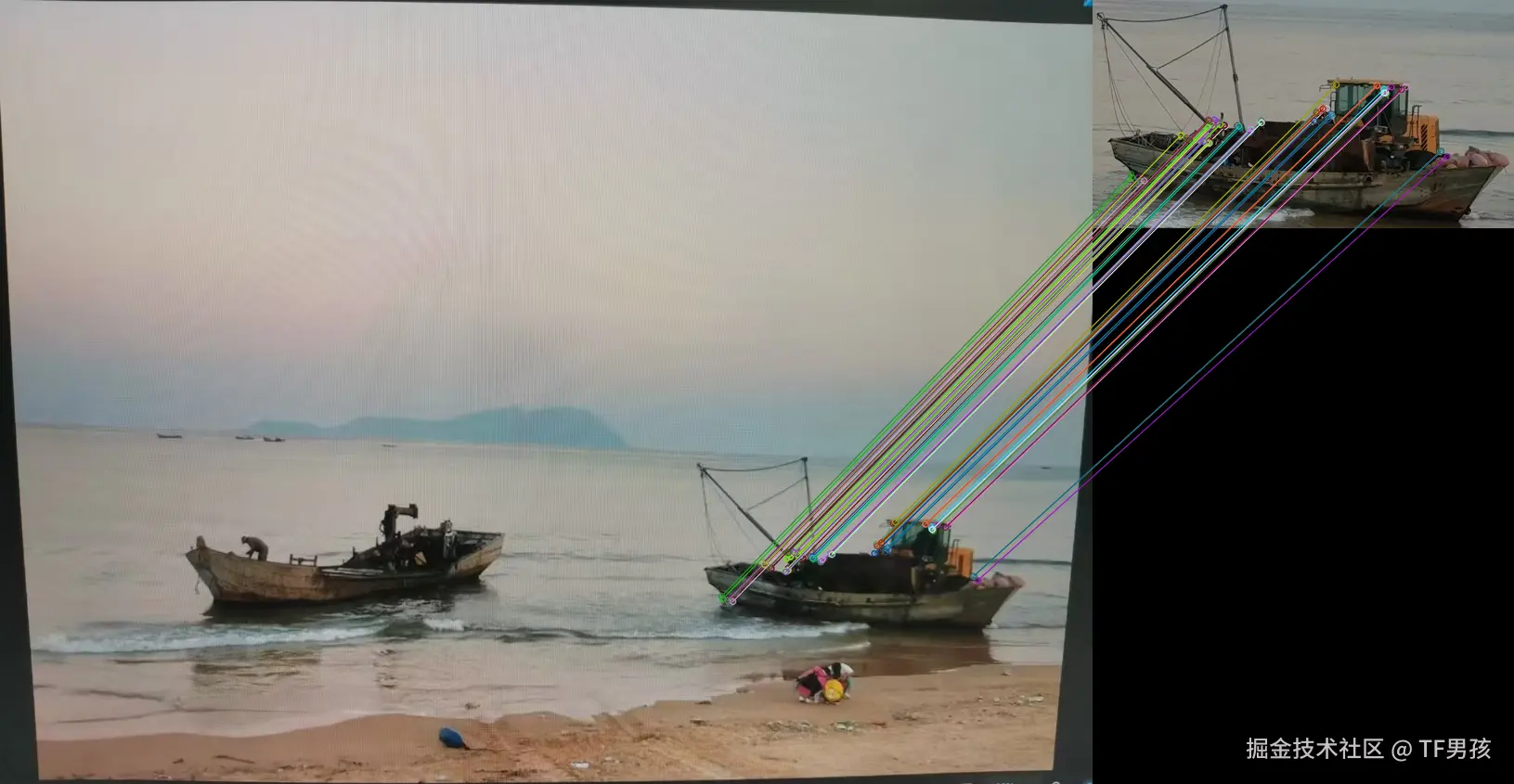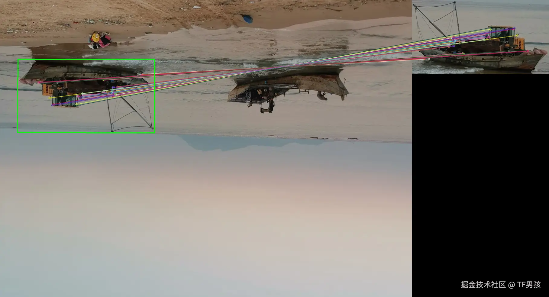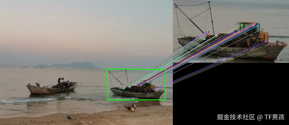 下面的两艘船,它们相似特征点挺多的。只所以选中右边的那个,是因为选取了差异更小的、匹配更多,而且加了交叉验证的一方。