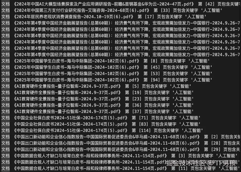 为此,我写了一个关键词筛选的功能。只需要输入“人工智能”,程序就可以从几百个文件中,找到哪个文件的第几页提到了“人工智能”。