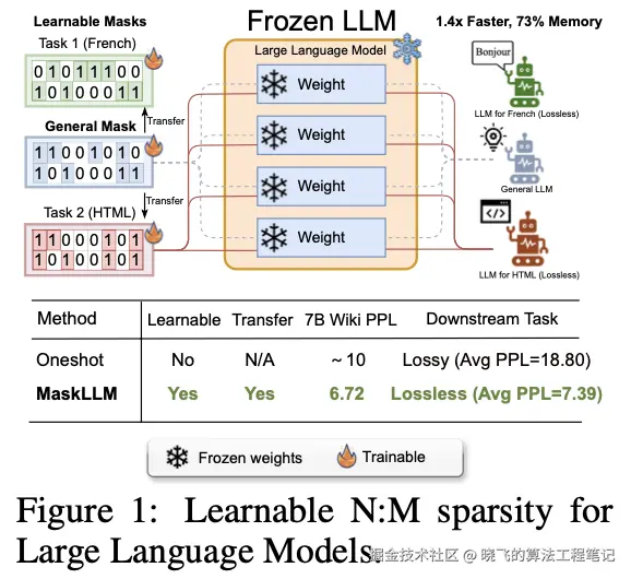 LLM半结构化剪枝方法MaskLLM,旨在充分利用大规模数据集来学习准确的N:M掩码,适用于通用剪枝和领域特定剪枝。