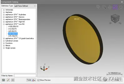 激光扫描系统(LSC.0001 v1.0) 使用非球面透镜对激光扫描系统进行性能分析 应用案例概述 系统细节 光源- 绿光二极管元件- 双轴振镜扫描仪- 非球面透镜探测器- 场曲和畸变- 光束强度剖面- 焦点区域探测器- 光束参数模拟/设计- 光线追迹:分析场曲和畸变,场追迹引擎的探测器的定位- 场追迹:考虑衍射效应,进行更精确的光束尺寸和剖面的研究 系统说明 激光扫描系统的性能评估 一个激光扫描系统的扫描光学部分包含了一个扫描仪单元和一个非球面透镜,在一维扫描过程中(沿入射角Theta),通过分析光束的场曲和畸变来评估其性能。此外,计算了不同扫描位置处的光束尺寸和轮廓。 模拟设计结果 VirtualLab Fusion的其他特征 在本例中,您受益于以下选择的特征:各种探测器- 使用场曲和畸变探测器(Field Curvature and Distortion Detector)中的找到焦点位置工具(Find Focus Position Tool)来测量焦点和光束位置- 使用焦点区域探测器计算焦点区域中的场参数耦合- 调整与理想输入扫描光学扫描角θ镜子的方向有关参数运行- 生成场曲和畸变图 总结VirtualLab可以模拟使用双轴扫描镜和特定的光学扫描的激光扫描系统分析目标平面上的光束偏转- 通过光线追迹来计算场曲和畸变- 通过几何场追迹来计算光束剖面- 场追迹可以更准确地分析光束焦点 应用案例详述系统参数 应用案例内容LSC.0001和LSC.0002为激光扫描系统。在这个例子中,分析了作为扫描透镜的非球面透镜的场曲和畸变,以来模拟一个扫描过程。在LSC.0002中,演示了通过使用F-Theta物镜来提高性能。 模拟任务 为了评估激光扫描系统的性能,在一维扫描过程中沿着入射角θ探测场曲和畸变。 规格:输入激光光束 激光组件中的单模二极管激光器 规格:双轴振镜扫描仪 规格:非球面透镜 从Asphericon目录中选择一个凸平面(convex-plano)非球面透镜作为激光扫描系统的扫描光学透镜。 原始透镜(目录和网址) VirtualLab“LightTrans定义”的元件目录包含例如Asphericon公司的透镜。此外,在他们网站上Asphericon还提供了VirtualLab文件。 应用案例详情 模拟和结果 双轴扫描反射镜的位置 双轴镜子同样由两个分离的镜子组成。第一镜将目标光束偏转到x方向,而光束沿第二个镜子的旋转轴偏转。第二反射镜将目标光束偏转到y方向。 设置扫描镜 扫描镜X沿y轴旋转,使用基础方位角进行旋转,与光轴之间的角度为45°(见左图)。扫描镜Y的调整是相当于绕x轴的旋转(见右图)。请注意,在VirtualLab中坐标系统是根据反射定律来旋转的,光轴是沿方向z ⃑来定义的。两个镜子的基础方位角定义了激光扫描仪的中心位置。使用镜子的绝对方位角,相对于固定的中心位置(光轴),光束在x方向和y方向上偏离。 轴上的3D光线追迹分析 不同Theta角的光线追迹说明 在光学扫描系统前定义输入扫描角Theta。 通过参数耦合进行系统调整 对于一维扫描过程,使用参数耦合工具。 扫描镜Y的绝对方位角是自动设置为期望输入扫描角。 1. 用户输入扫描透镜期望的输入扫描角度2. 系统参数3. 输入变量4. 源代码编辑器(脚本定义) 离轴25º的3D光线追迹分析 场曲和畸变探测器 通过寻找焦点位置工具(Find Focus Position Tool),场曲和畸变探测器可以测量3D焦点位置,且光束位置依赖于在扫描光学之前的球形输入角θ的在屏幕上的测量光束位置。因此,必须通过参数耦合工具给探测器提供θ的输入角。 执行扫描过程对于扫描过程角度θ,通过参数耦合工具来设置扫描镜,沿着y轴从1°到25°扫描,步长为1°。只有沿着y轴扫描,弧矢焦点由x方向的光斑尺寸决定,子午焦点由y方向的光斑尺寸决定(后面将会介绍弧矢和子午平面)。从参数运行文档,可以绘制场曲图和畸变图。使用一维数值数据阵列多重图表模式将子午(1)和弧矢(2)场曲和畸变数据结合在一起。 场曲 通过光线束的焦点到探测器的间隔∆z,沿z轴来测量场曲 。因此,在两个分离的平面,焦点是通过(RMS spot radii)均方根半径确定:子午和弧矢平面。其如下图的一个成像光学系统所示,类似于激光系统。对于一个平面成像面,这是测量离轴光束的离焦的一个标准。完美的图像应位于曲面而不是一个平面。对于一个激光扫描系统,这一点是必须考虑的。 场曲率 下图在显示了子午面和弧矢面的场曲。从结果上看,沿z轴测量场曲率,弧矢场曲要小于子午场曲。 弧矢和子午面焦点的z偏离的多图视图 畸变畸变定义为光线束在探测器面上横向位置y到参考位置的偏差Distortion=(yBundle-yRef)/yRef,其中yRef =EFL∙tan(Θ) 对于F-Tan(θ)畸变yRef =EEFL∙Θ 对于F-Theta畸变yBundle 探测器平面上光束质心或光束主光线的位置使用扫描光学系统的有效焦距EFL可以计算探测器平面的位置,这主要取决于入射角。 畸变畸变是输入扫描角到偏转光束的理想探测器位置的线性测量,因此,畸变是探测器平面上光束位置像差的一个影响条件。线性依赖关系可能是tan(Θ)或者在F-Theta物镜中是Θ(LSC.0002)。很明显,相比于F-Tan(θ)特性,非球面透镜能够更好的校正F-Theta。这是由于相比于球面透镜,非球面透镜进行部分像差校正。 分析轴上的光束剖面 入射角到非球面透镜是0°。为了更准确的评估焦点光斑,使用几何场追迹(Geometric Field Tracing )和焦区域探测器(Focal Region Detector)分析光束剖面。因此,与光线追迹的结果相比,由于场追迹可以直接评价光束剖面,包括能量分布和光束发散角。,因此产生的焦点光斑