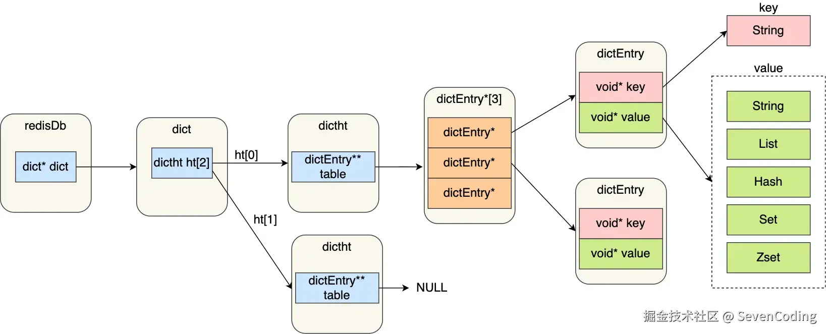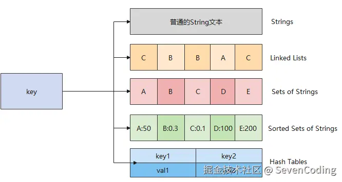 Redis中的数据类型指的是 value存储的数据类型,key都是以String类型存储的,value根据场景需要,可以以String、List等类型进行存储。