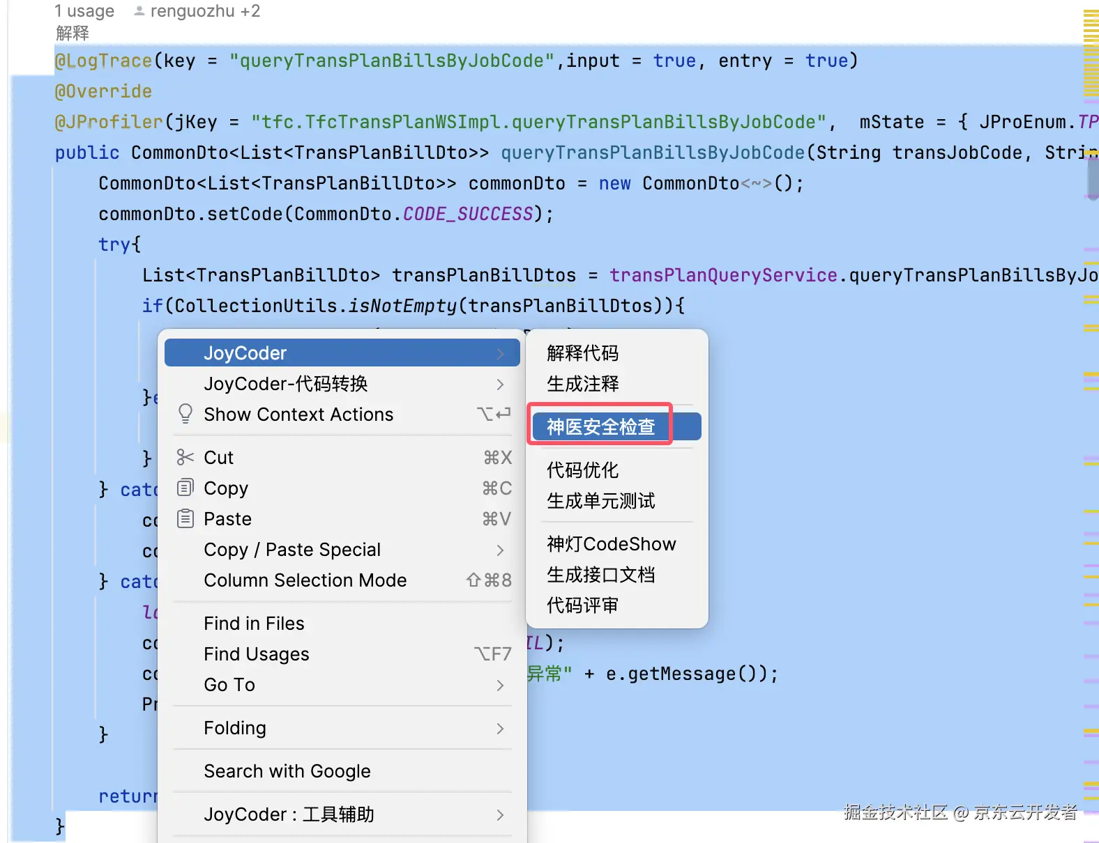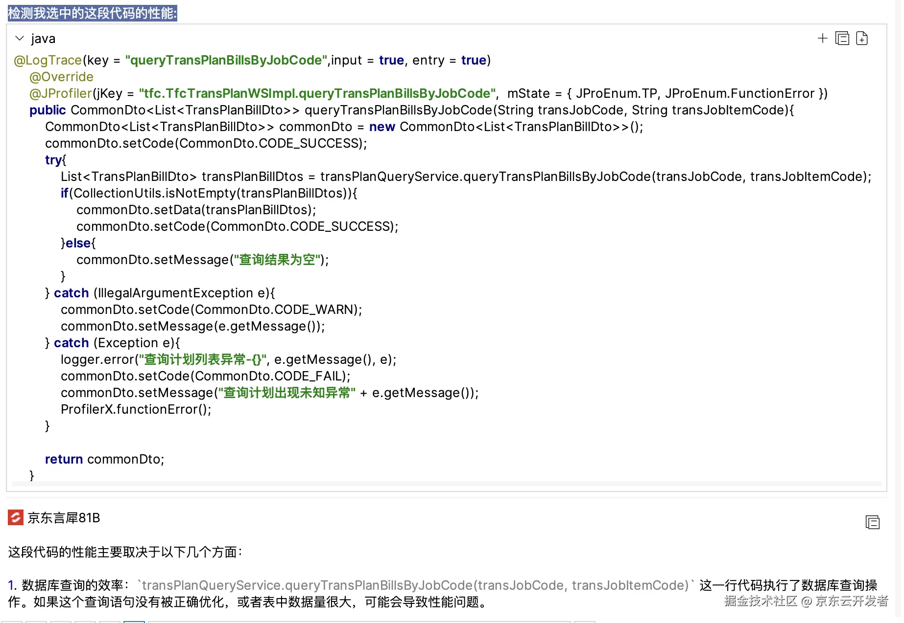 可以通过选中一段代码,然后在JoyCoder的对话框里输入:检测我选中的这段代码的性能,并回车