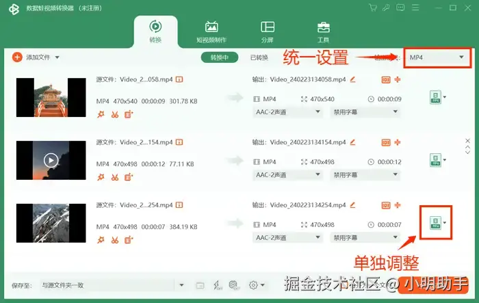 步骤三: 视频文件上传好之后,可以点击界面右上角【输出格式】旁的选择框进行统一的输出格式设置,也可以点击视频文件对应的右侧绿色图标设置单个文件的输出格式。