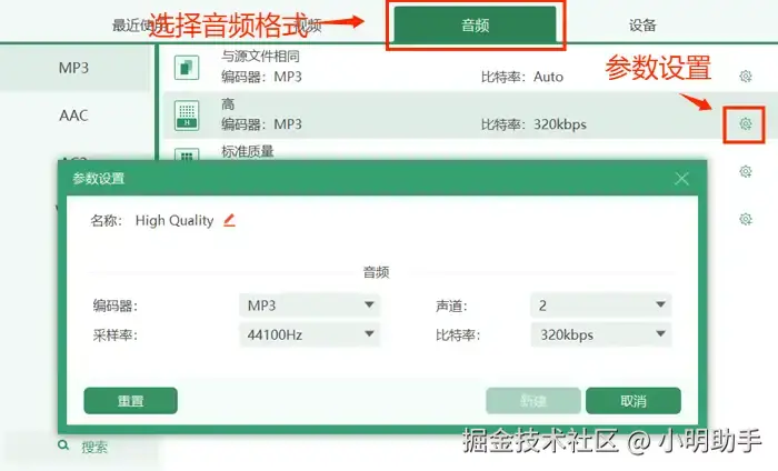 步骤四: 进入格式设置界面后,点击界面上方的【音频】按钮,选择自己需要的音频格式。还可以点击界面右侧的小齿轮按钮设置【比特率】等参数。