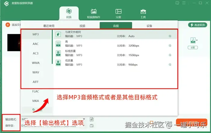 第二步:选择【输出格式】选项,点击音频格式选项,选择MP3音频格式或者是其他目标格式。