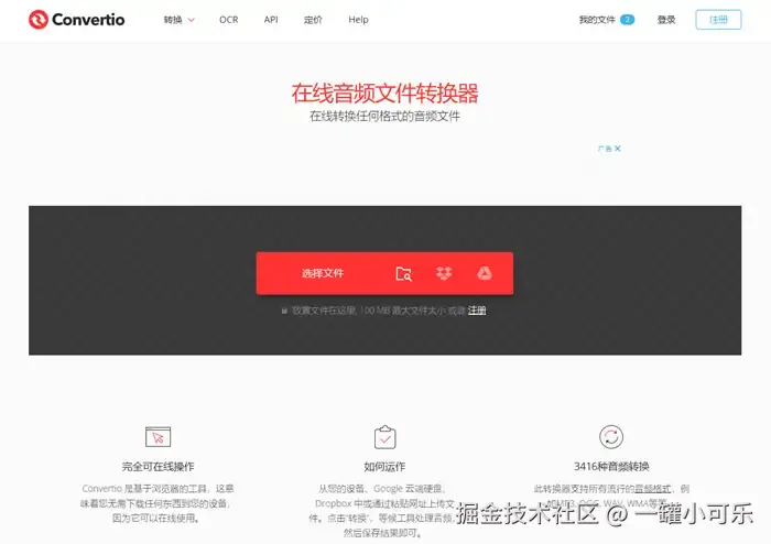 Convertio也是免费格式转换网站,支持用户完全在线操作以及所有流行的音频格式,适应所有平台和设备。但该网站同样也有文件大小上传限制,其不支持转换超过100M以上的文件格式。使用该网站进行音频格式转换的操作步骤是:点击【选择文件】上传音频文件,选择需要转换格式,再点击【转换】。