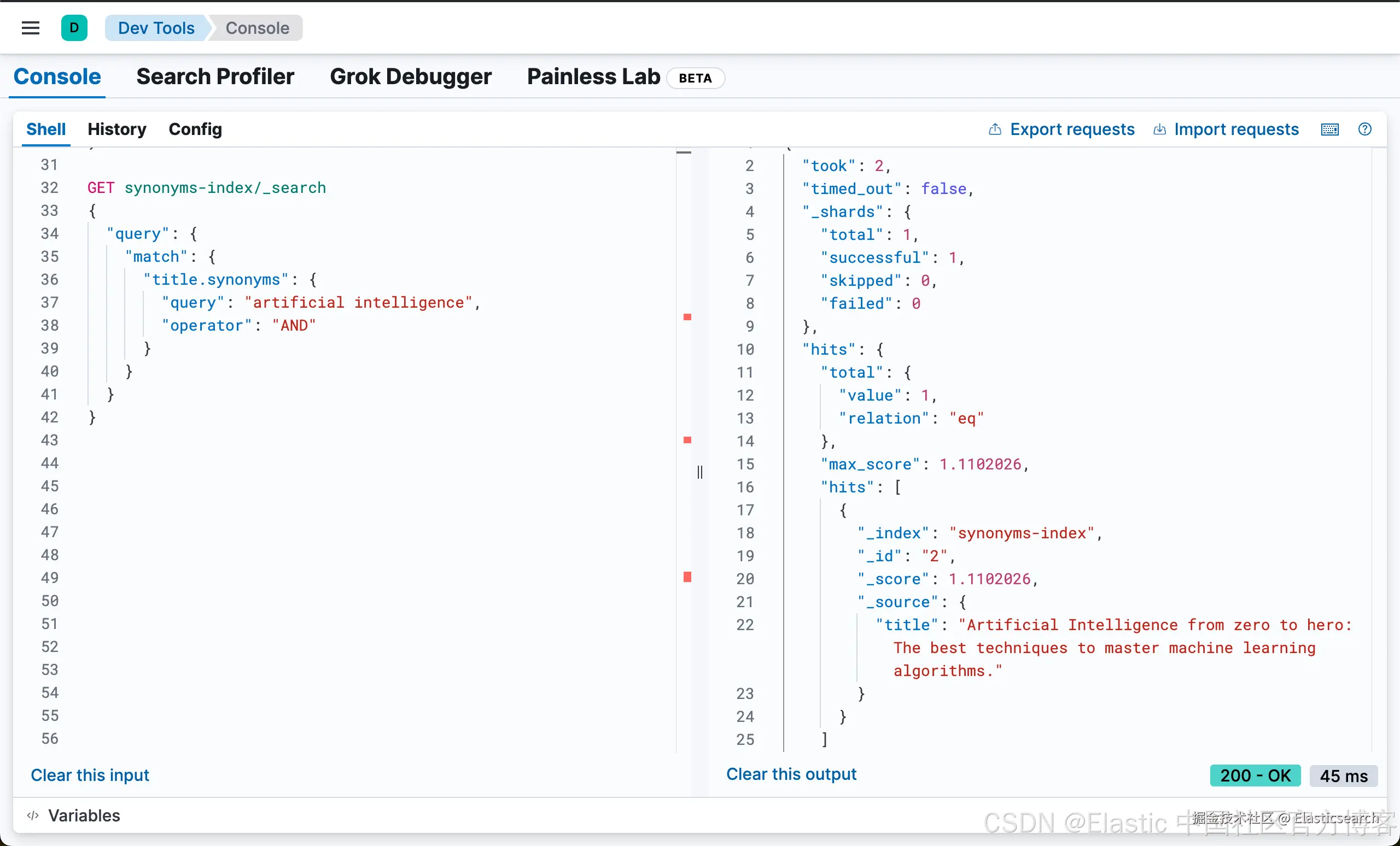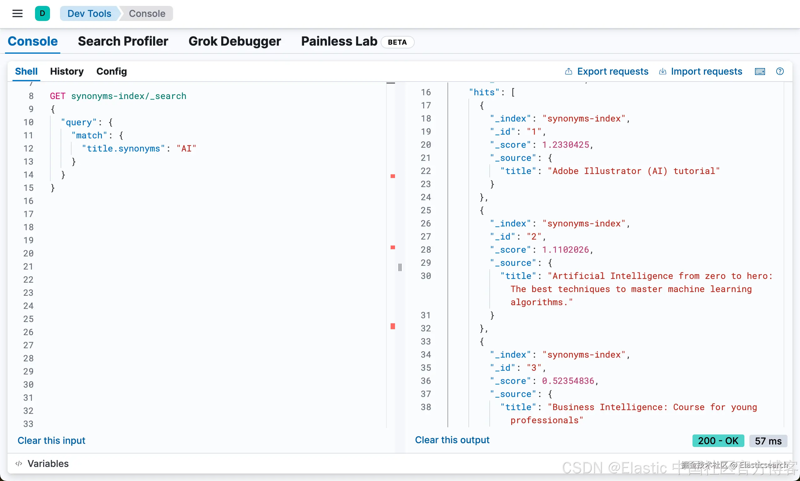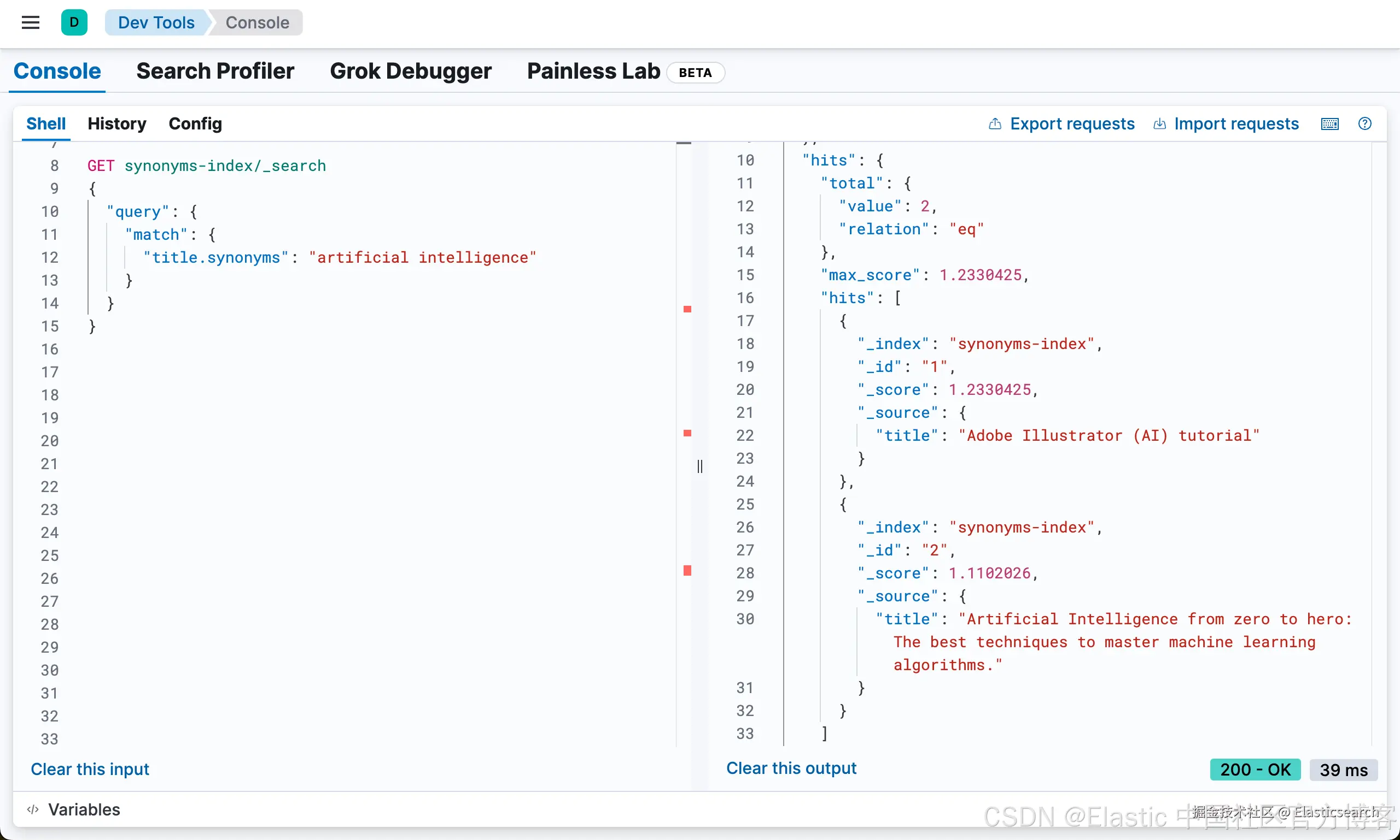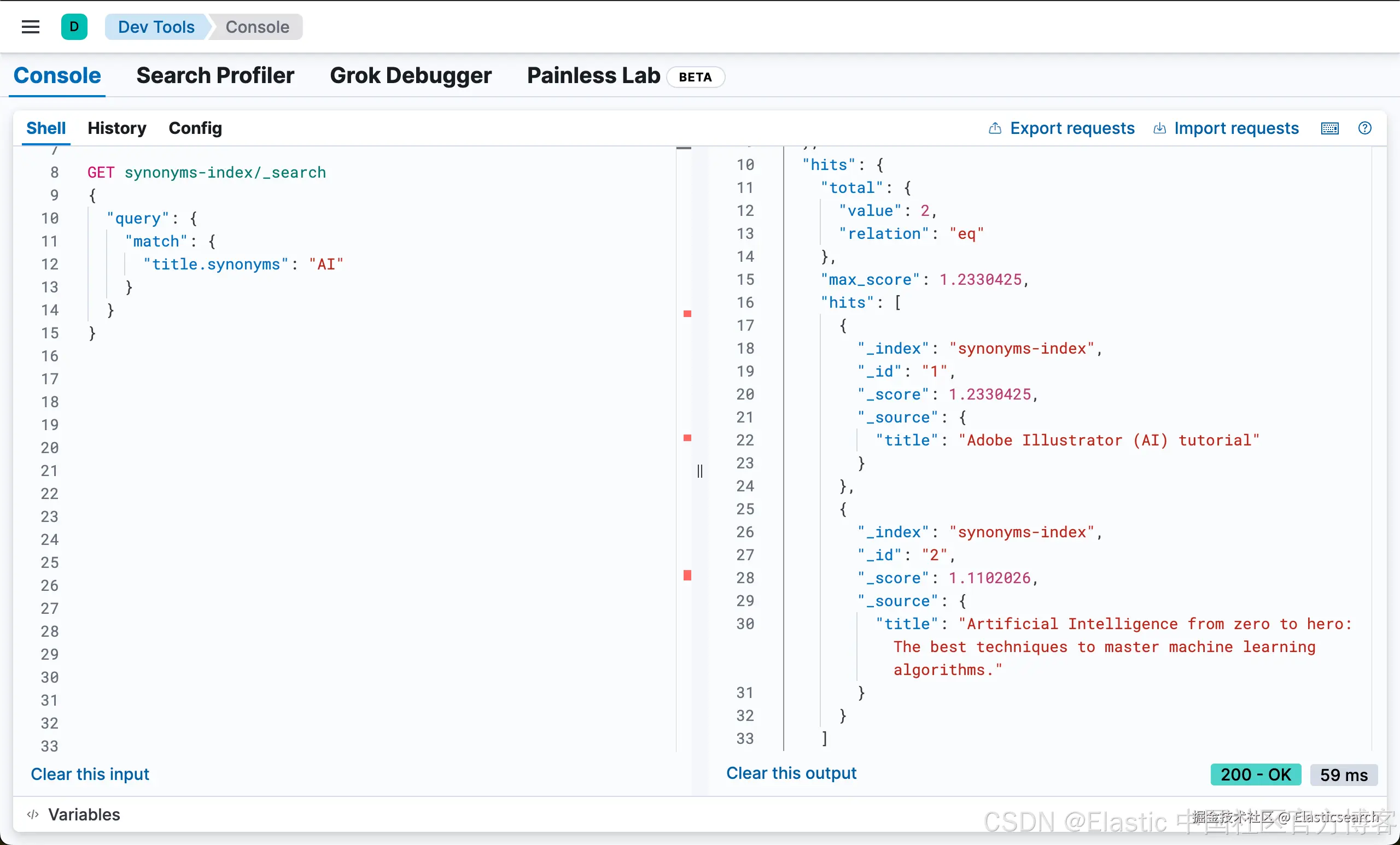 在上一个示例中,我们使用了不支持多词或短语同义词的 token synonym filter 。这就是将 Business Intelligence 与 AI 匹配的原因。Artificial 和 Intelligence 不被视为短语,而是单个标记。让我们来解决这个问题!