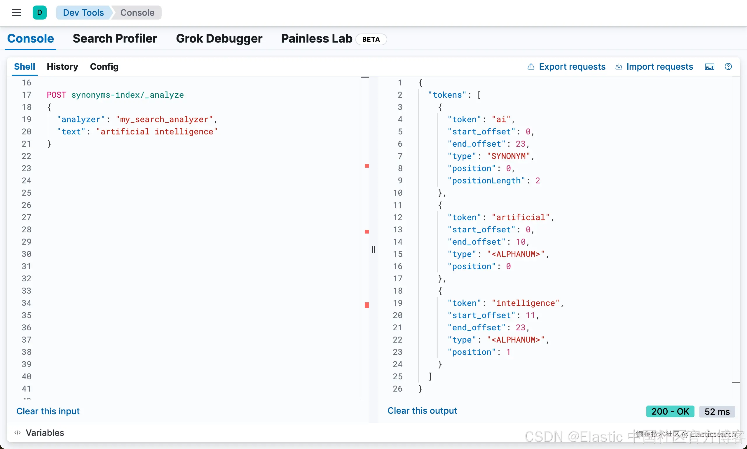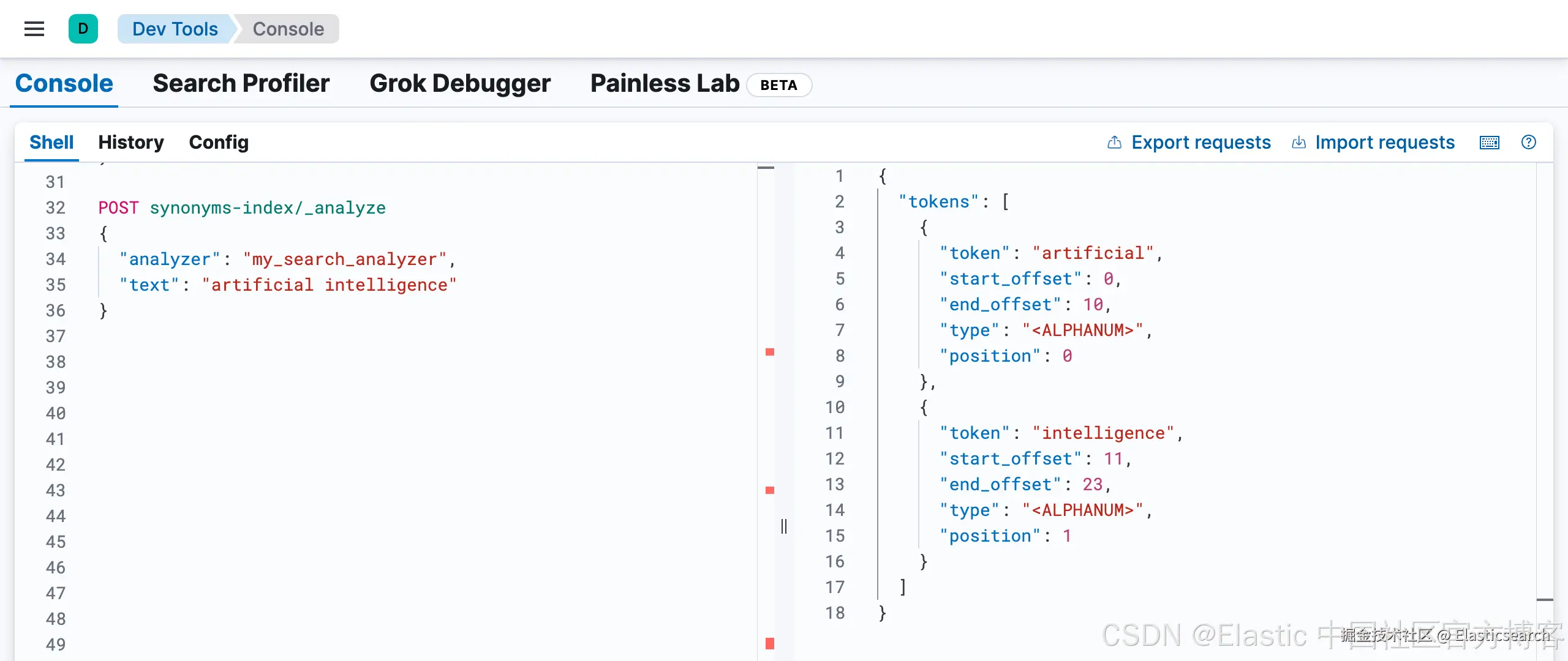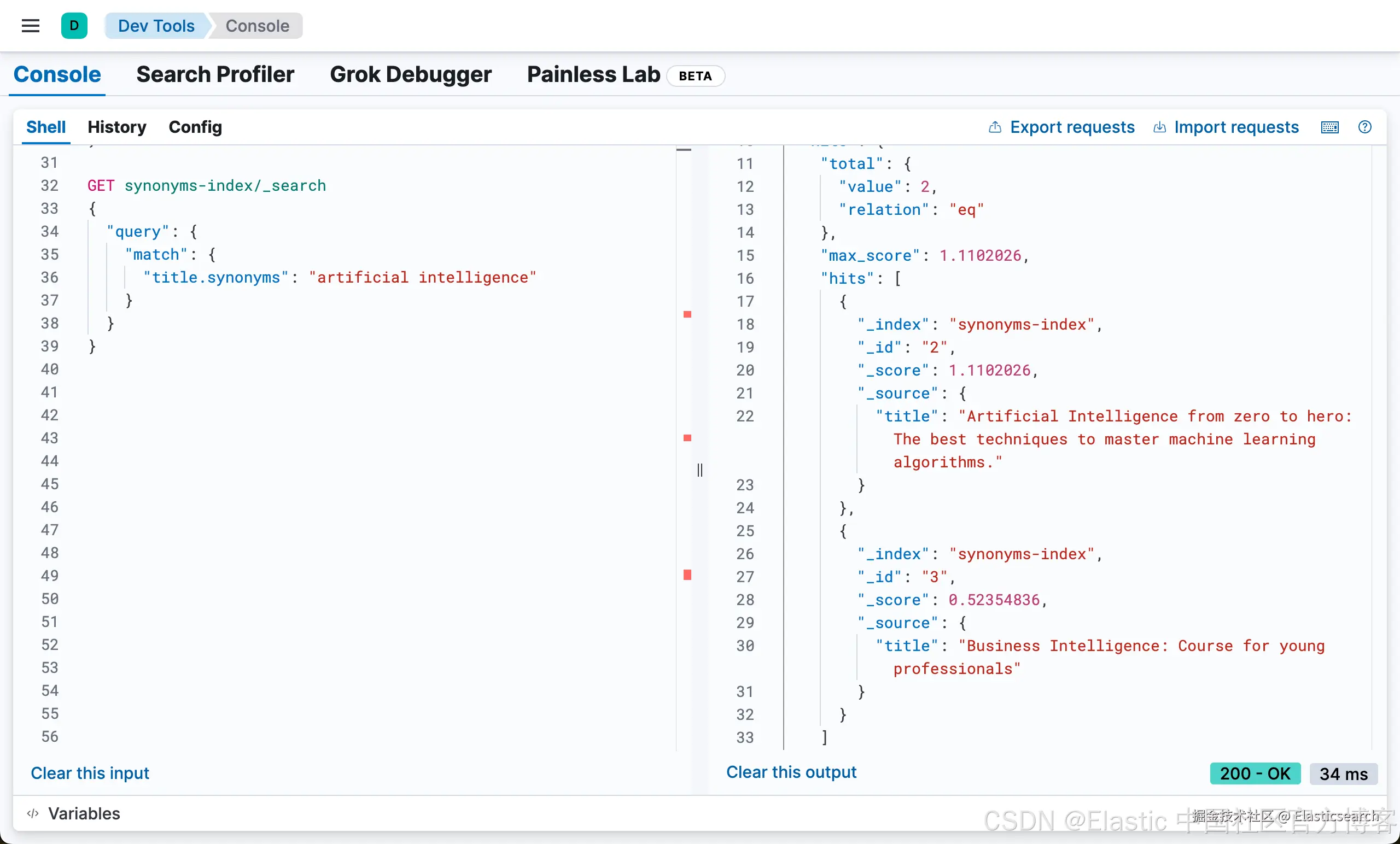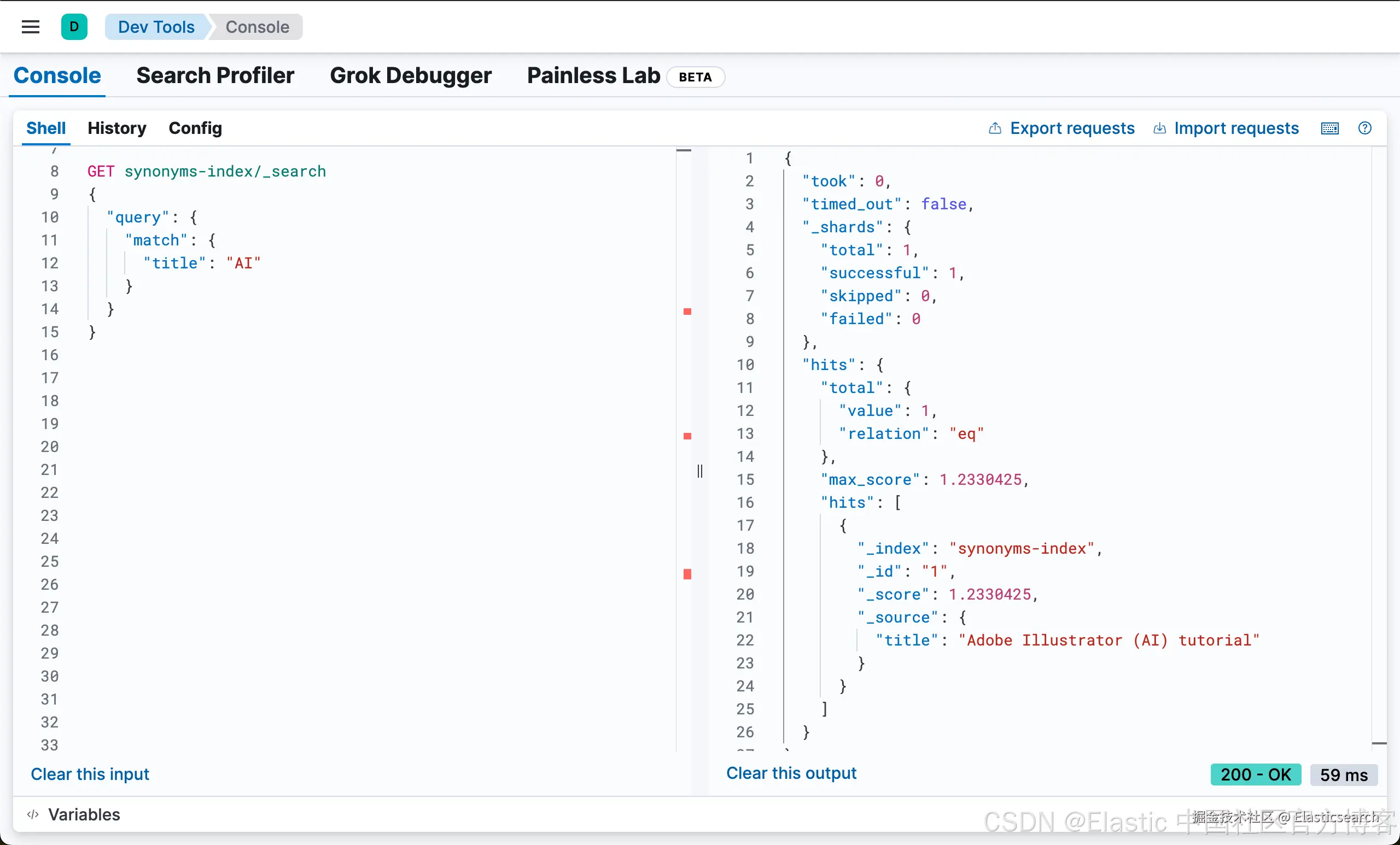 在上一个示例中,我们使用了不支持多词或短语同义词的 token synonym filter 。这就是将 Business Intelligence 与 AI 匹配的原因。Artificial 和 Intelligence 不被视为短语,而是单个标记。让我们来解决这个问题!