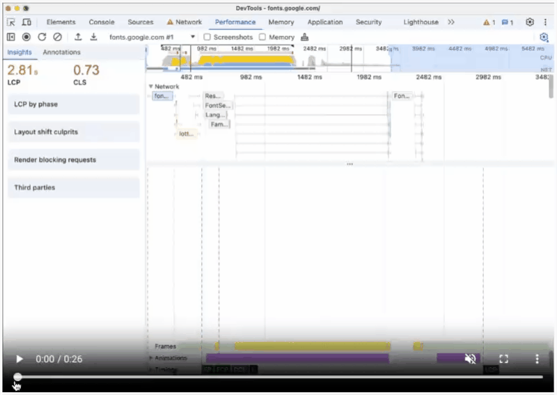 要利用这些分析,打开 Performance 面板左侧的 Insights 标签,展开不同的类别,悬停并点击项目,Performance 面板会在追踪中高亮显示对应的事件。