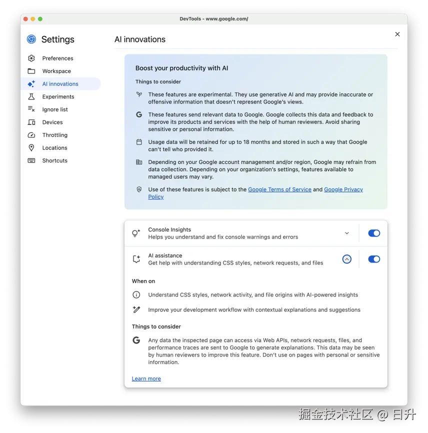 DevTools 现在不再需要开启设置同步才能使用 AI 功能。因此,之前发布的控制台洞察功能和用于样式调试的 AI 辅助功能,只需一键即可访问。