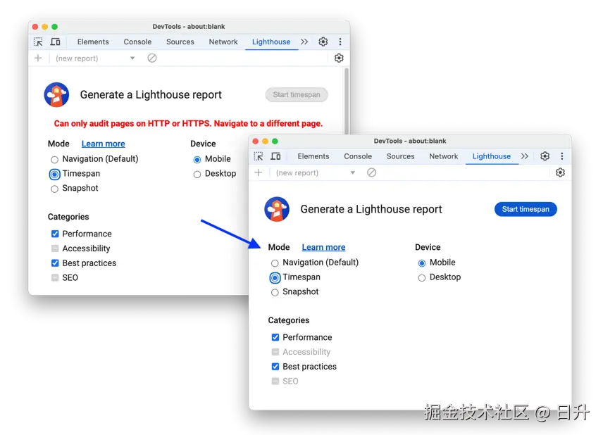 Lighthouse 现在可以在 时间跨度 和 快照模式 下为 非 HTTP 页面 生成报告。