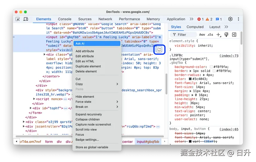 在 Elements 面板中,右键点击一个元素并选择 Ask AI,或者点击该元素旁边的对应按钮,DevTools 会打开新的 AI 辅助面板。