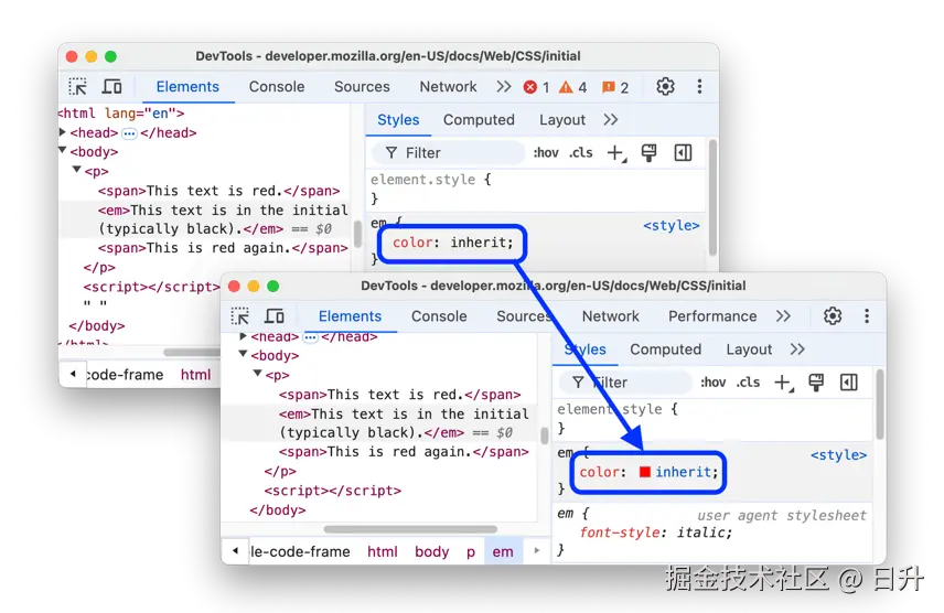 解析 CSS-wide 关键字,这意味着例如,如果 inherit 是颜色属性,Styles 标签将会在其旁边显示一个颜色选择器。