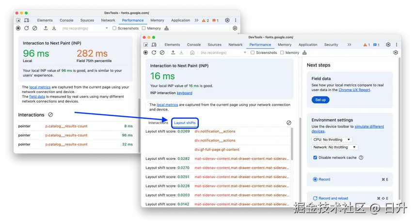 实时指标视图新增了 Layout shifts 日志,显示了布局偏移的得分和涉及的元素,位于 Interactions 标签旁边。