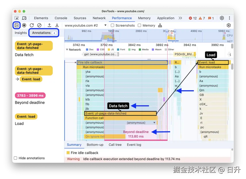 可以直接在追踪中标注事件、连接事件并使用箭头指示关系,还可以突出显示时间范围。完成注释后,可以保存、分享并将注释后的追踪文件重新上传回 Performance 面板,方便与他人协作和进一步分析。