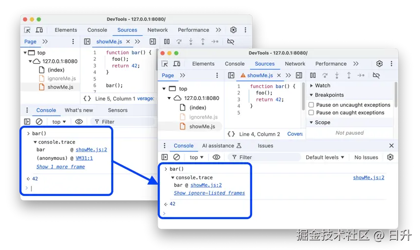 Console 中的堆栈跟踪可以正确地检测、忽略、折叠并(在展开时)灰掉来自忽略列表文件的堆栈帧。之前,它没有在展开的堆栈跟踪中灰掉函数名称。