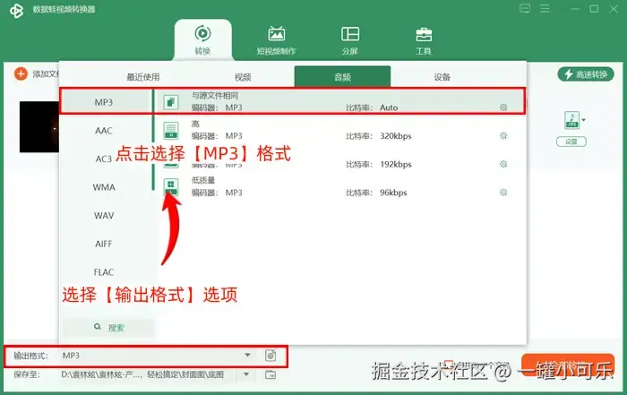 第二步:选择【输出格式】选项,根据其弹出来的格式选择界面,点击选择【MP3】格式,如需设置格式参数,可直接点击界面上的参数按钮。