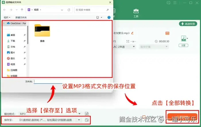 第三步:返回格式转换界面,选择【保存至】选项,设置MP3格式文件的保存位置,然后点击【全部转换】即可。