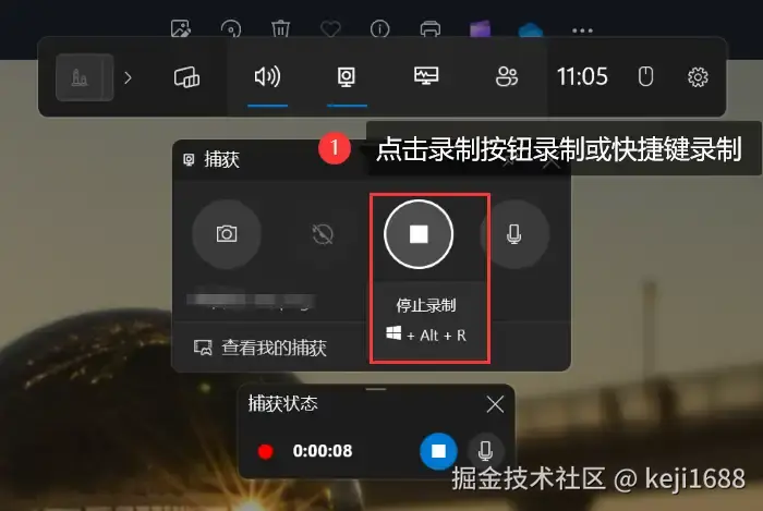 步骤2:点击 【捕获】 按钮或使用快捷键 【Win+Alt+R】 开始录制。