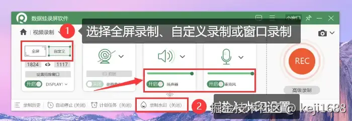 步骤2:在 【视频录制】 页面,先选择好录制的区域(如全屏录制、区域录制或窗口录制),软件会默认无水印模式录制,但如果您需要对水印进行不同的设置,也可以进入水印设置中进行选择。开启录制声音后,点击 【REC】 按钮开始录制。