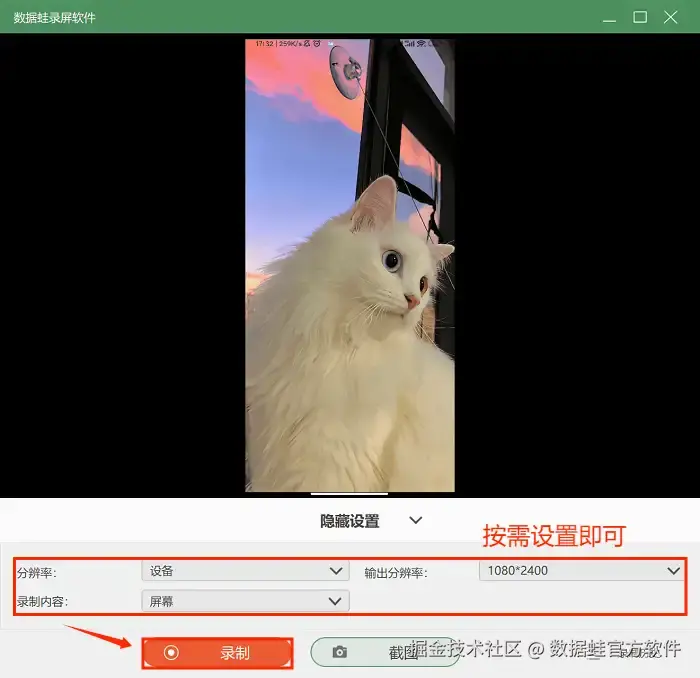 步骤3: 在录制开始前,你可以调节录屏的分辨率与输出分辨率,选择合适的录制内容。调整完毕后,点击 “开始录制” 就可以录制你的vivo手机屏幕啦。