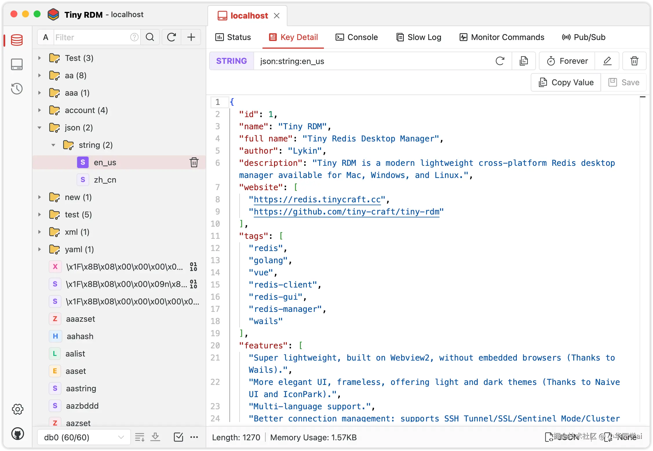 Tiny RDM 是一款现代化、轻量级的跨平台Redis桌面客户端。它支持Mac、Windows和Linux系统,提供了丰富的功能特性,旨在为开发者提供便捷、高效的Redis操作体验。