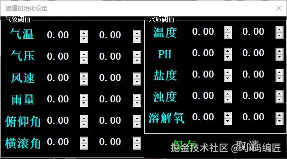 初始化阈值设定:点击初始化阈值设定按钮打开初始阈值界面,可设定传感器数据监测范围,设定完后保存。点取消退出设定界面。初始阈值数据保存本地,即软件刚使用时设定完即可,一般不可更改。