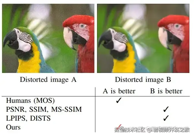 尽管图像 A 中的大背景区域有噪声,但人类为 A 分配的质量Mos打分比 B 更高,因为 A 中鸟类的区域要清晰得多。这表明人类倾向于关注语义上更重要的区域。LPIPS 和 DISTS 等简单的多尺度方法忽略了高级语义和低级失真之间的相关性,因此与人类相比会产生不一致的判断。