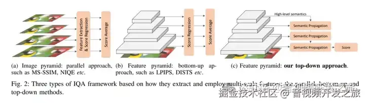 如MS-SSIM, NIQE等:这类方法并行地在不同分辨率的图像上提取特征,每一层的图像代表不同的尺度。特征提取和分数计算在每一层上独立进行,然后分数被平均以得出最终的图像质量评分。