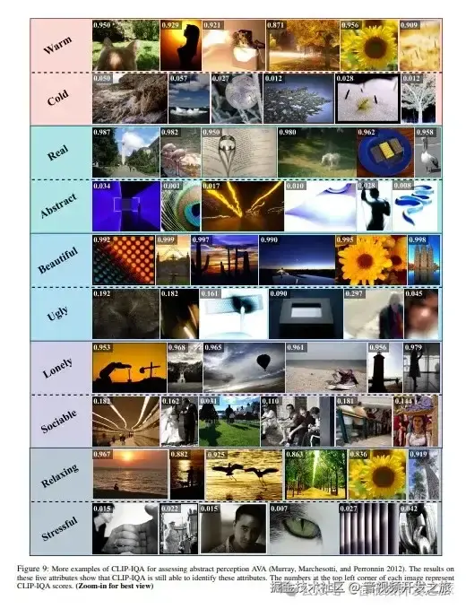 clip-iqa不仅可以区分不同图片画质,还可以识别暖/冷色、真实/抽象、美/丑、孤独/社交、放松/有压力等属性。