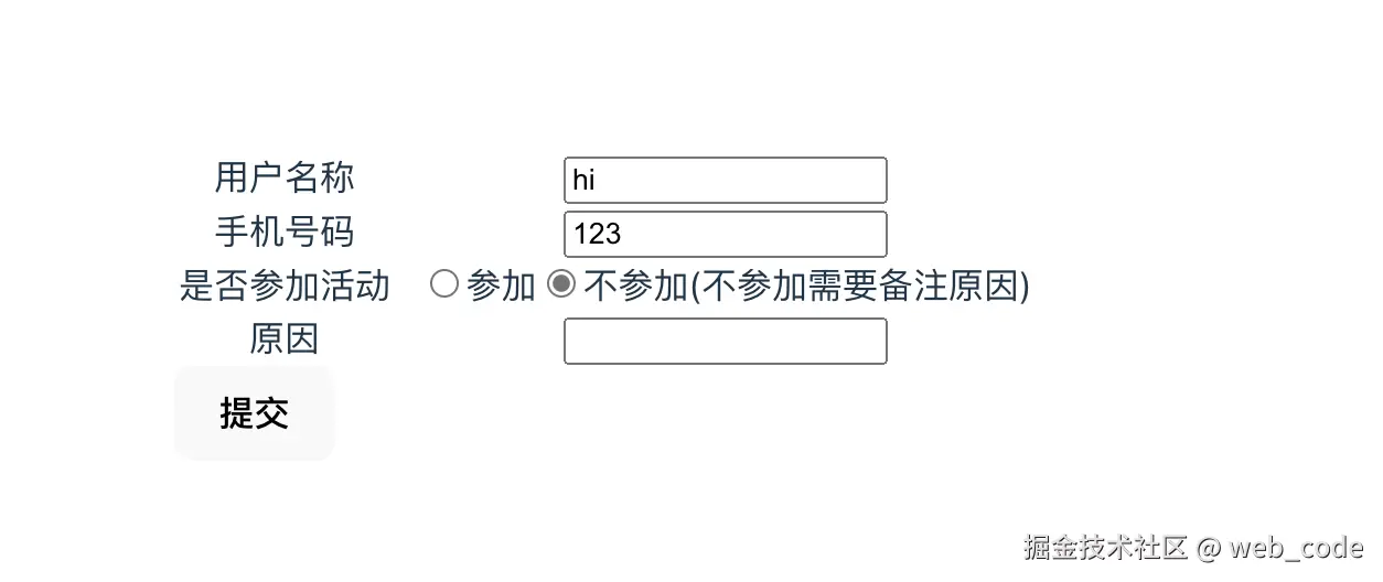 实现一个如下所示简单的动态表单,所谓的动态,基本都可以封装在配置里面,然后基于这份配置渲染出表单。