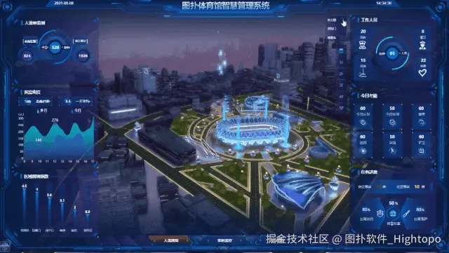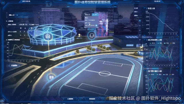 利用图扑 HT 可视化技术让 3D 场景与 2D 数据面板无缝融合、将监控系统与其他子系统(如报警、灯光、扩声等系统)联动可视,使管理者可以更好地掌控和协调场馆内的各项运营活动。