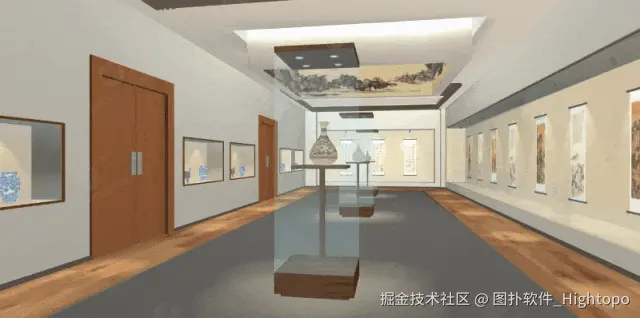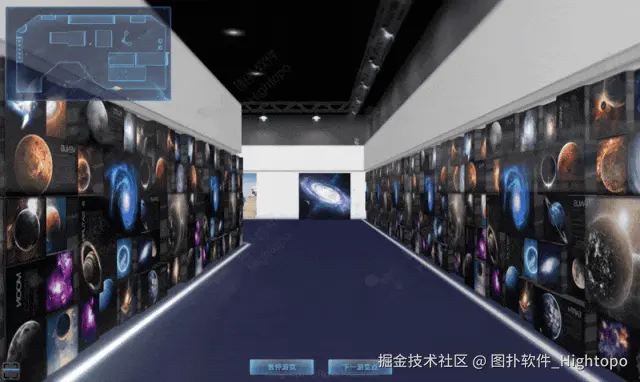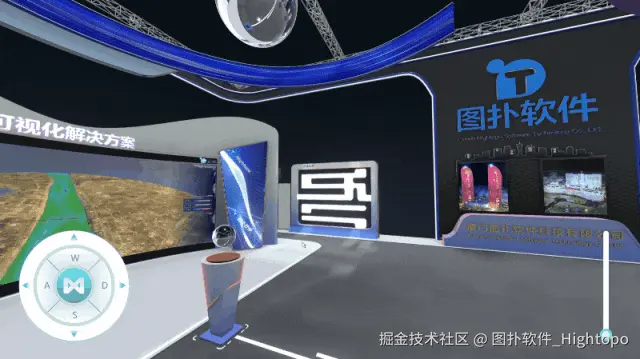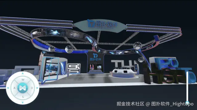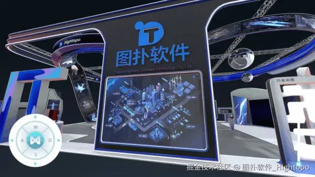 图扑软件运用 HT 强大的渲染功能,数字孪生“云展位”, 可以第一人称视角漫游,模拟用户在展厅内的参观场景,在保证作品在线展示的真实度的同时,也高效提升了用户的观感体验,极具沉浸感。