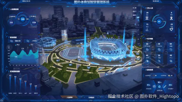 图扑智慧体育馆支持多屏联动和触控应用,通过数字孪生技术构建出真实场馆的三维虚拟仿真场景。运维管理人员能实时监控场馆设施状态、环境及人流动线等数据变化,大幅提升运营效率和管理精准度,助力场馆实现智慧化管理。